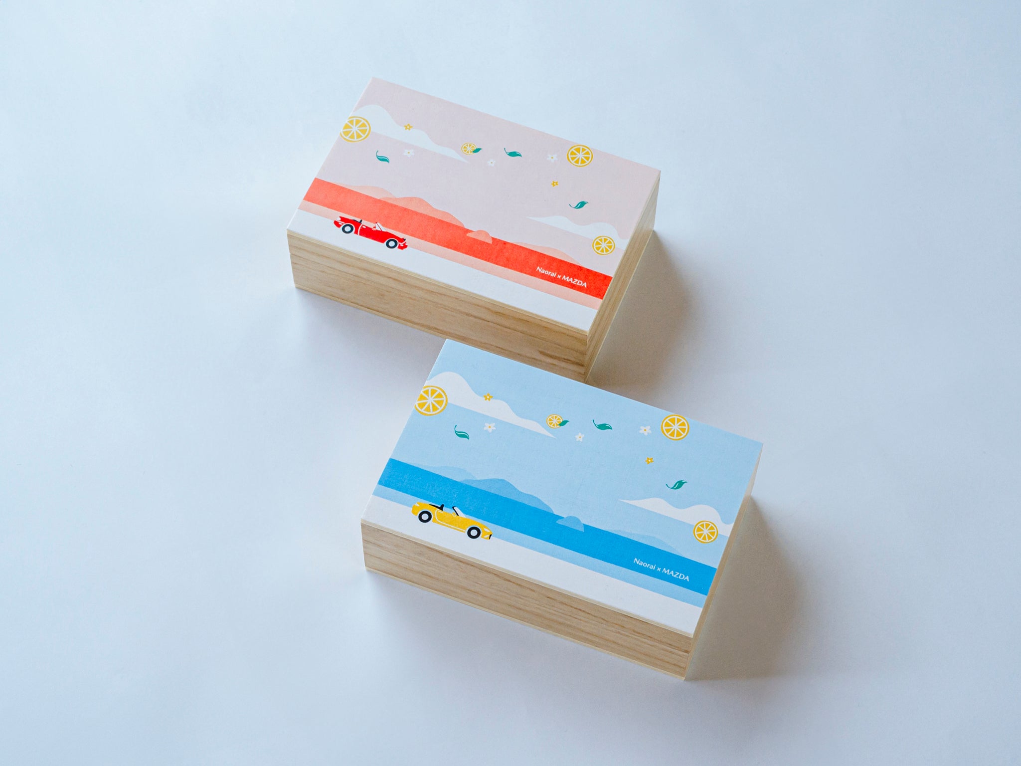 ミカドレモンオイルの香りと共に瀬戸内へドライブするイメージで製作、クルマを通じた楽しさと瀬戸内海の美しさを表現した特別デザイン木箱をマツダロードスターNAとNDの2種類で展開します。木箱の中には三角島エリアで無農薬栽培されたミカドレモンの皮から抽出したミカドレモンオイル、そしてアロマストーン缶が同梱されています。缶の中にはミカドレモンオイルの香りを楽しむアロマストーン(ロードスターのモチーフ入り)とオリジナルシールが入っています。